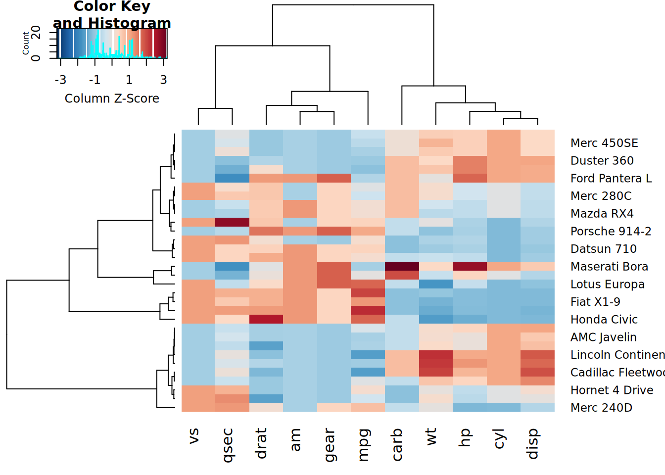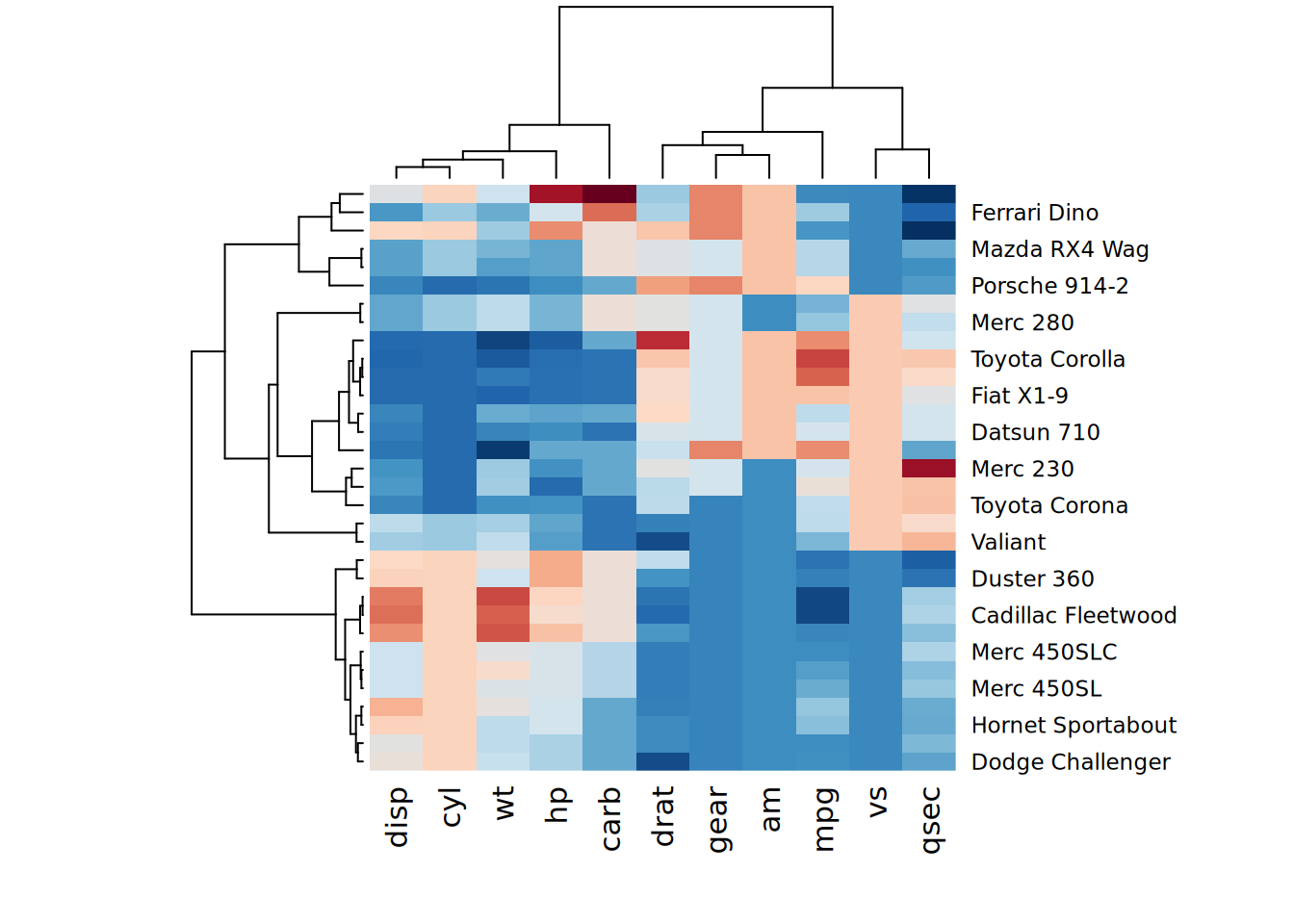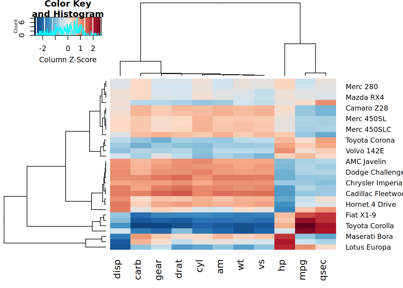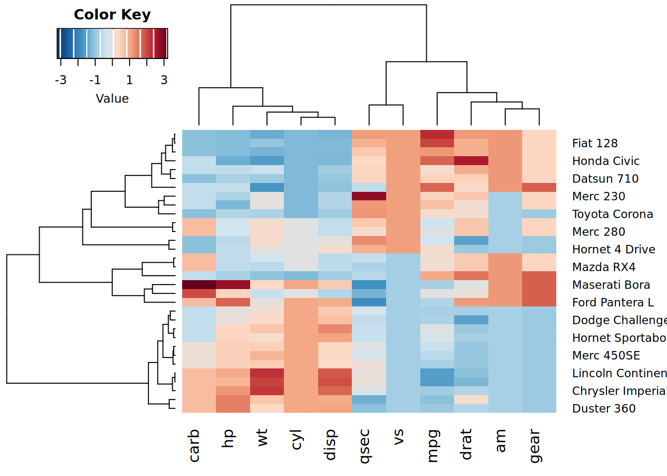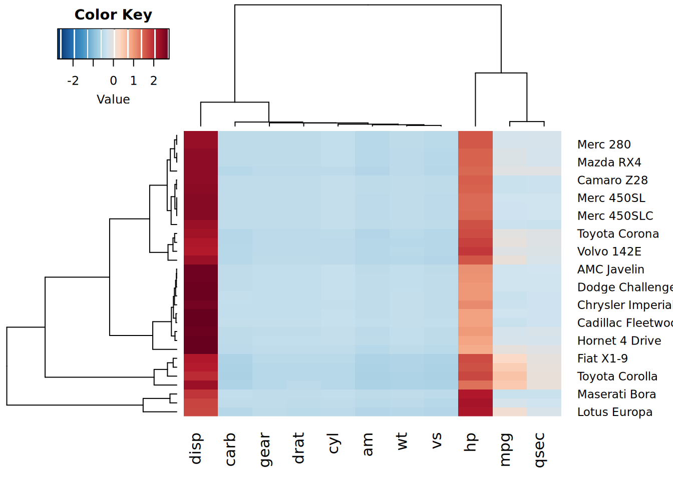 Much better! But wait! Did you see it? The colors in the plot changed. But the dendrogram did not! It turns out that the scale argument only refers to the scaling of the heat data, NOT what happens to the scaling before calculation of the dendrograms.